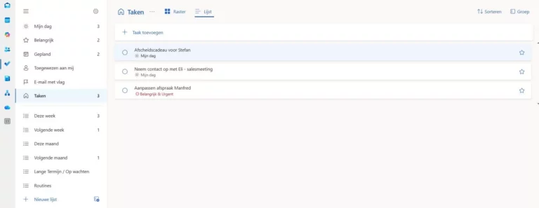 Elke ochtend kies ik bewust welke taken ik die dag wil oppakken via de functie Mijn Dag. Alles wat ik afrond, verdwijnt van mijn lijst (maar blijft wel vindbaar onder Voltooid). Wat niet lukt, blijft staan tot ik het opnieuw plan.