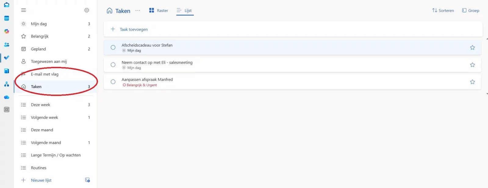 Zie hieronder, waar zowel de ‘E-mails met rode vlag’ en ‘Taken’ de input van jouw takenlijst zijn.